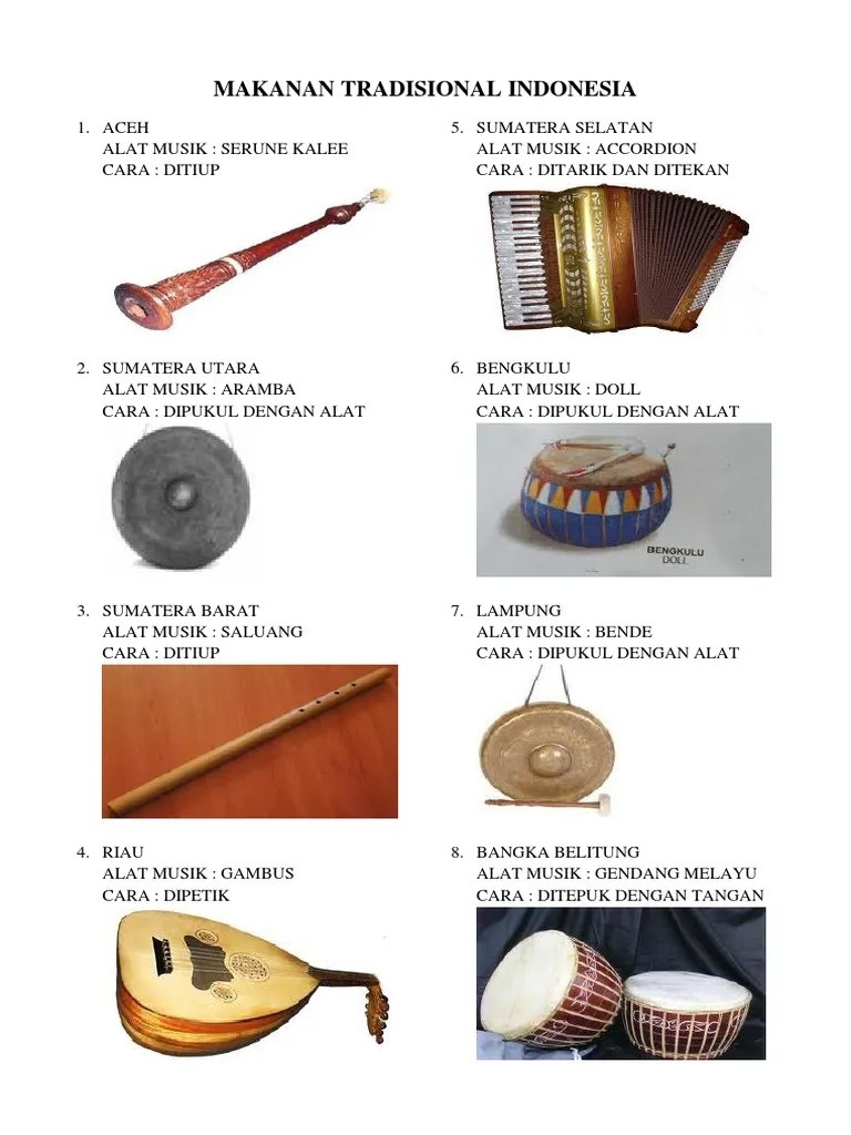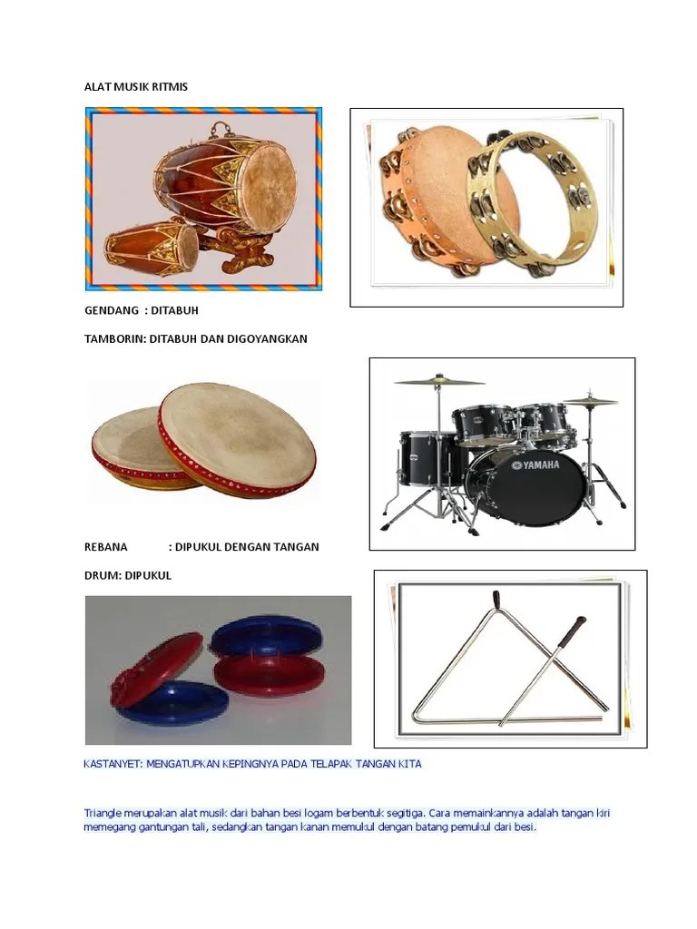 Gendang merupakan alat musik tradisional yang dimainkan dengan cara dipukul. Kendang · alat musik yang dipukul: Jelaskan asal alat musik itu, cara memainkannya, serta cara terjadinya bunyi. Sebagian besar alat musik ritmis dimainkan dengan cara dipukul, baik yang dipukul langsung dengan tangan ke permukaan alat musik atau dengan . Instrumen idiophone dapat dibuat dari .